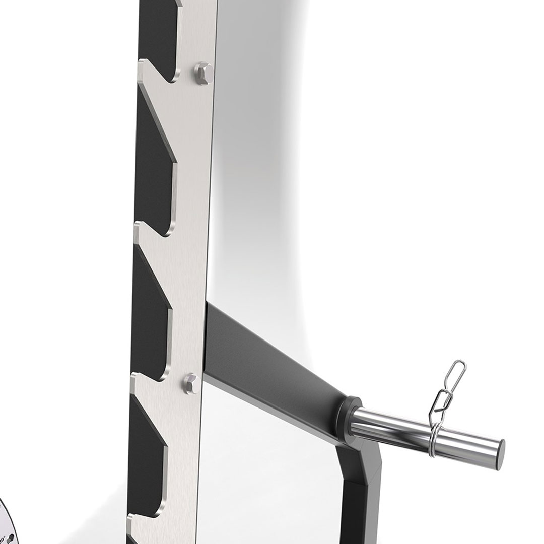 Ce banc est conçu pour un usage professionnel, avec une structure tubulaire en acier renforcé à section rectangulaire (100×50 mm, 75×50 mm, 60×40 mm) et une épaisseur de 3 mm, assurant une durabilité exceptionnelle. La hauteur de la barre est réglable sur 7 niveaux, et le banc est équipé de 4 broches porte-disques de 50 mm de diamètre. Les rouleaux pour les jambes sont amovibles pour un accès plus confortable, et la panca peut être utilisée en position inclinée, plane ou déclinée.