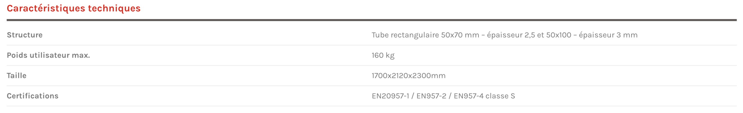 poulie double 3-EN-1, machine Smith, crémaillère. 2 crochets en J, paire de butées de sécurité pour haltères, barre de traction, barres parallèles, support d’haltères, 6 supports de disque ø50 mm, 8 supports de disque à ressort ø49 mm. Accessoires : chevillère, corde double triceps, chaîne, mine terrestre, 2 poignées de traction, plateforme antidérapante, double poignée, barre triceps, barre et barre CURL.