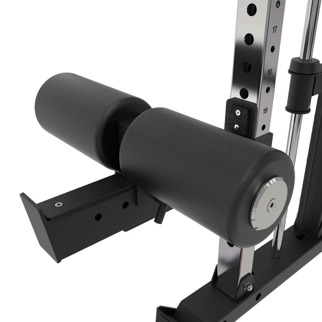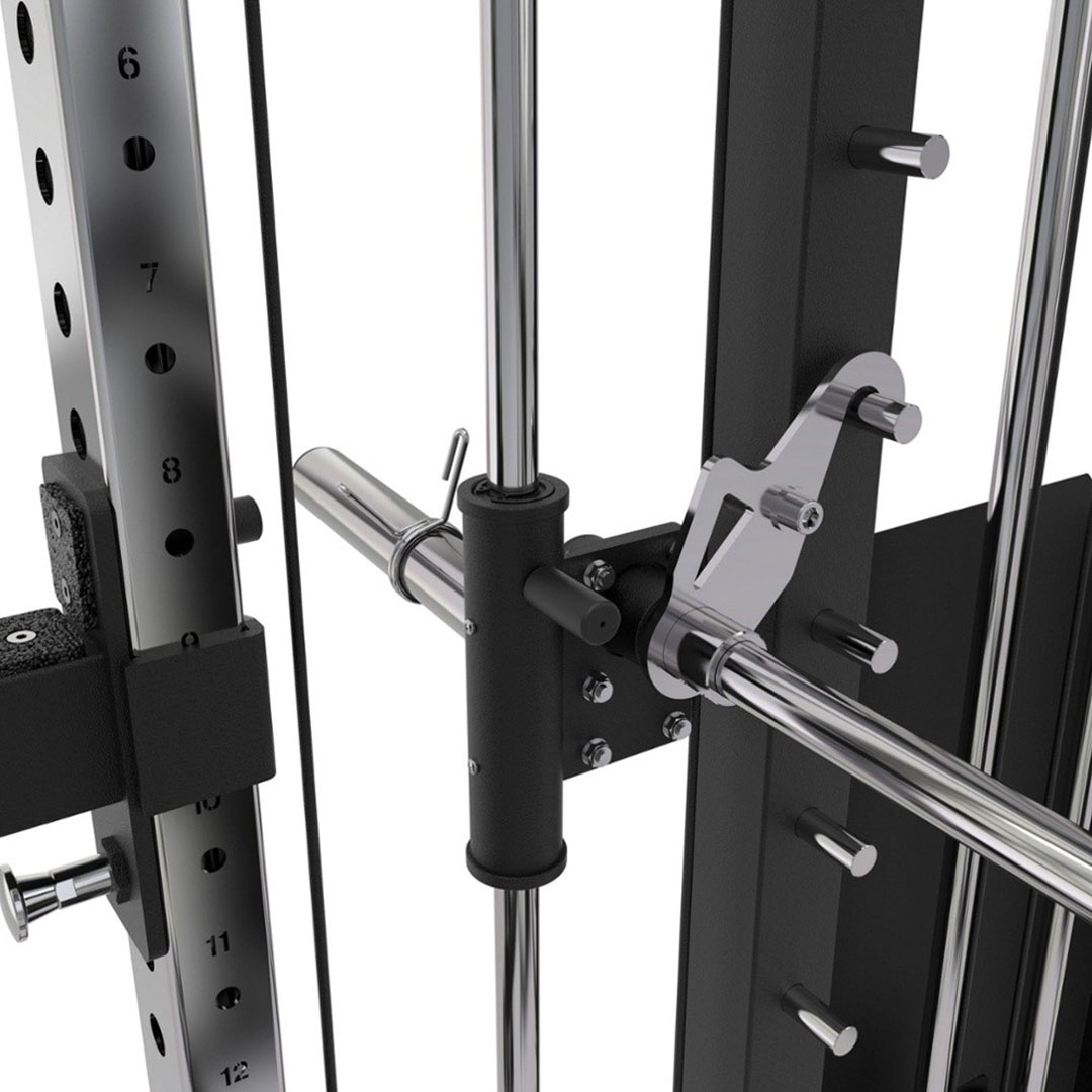 ÉQUIPEMENT Poulie double 3-EN-1, machine Smith, crémaillère. 2 crochets en J, 2 bras de sécurité, barre de traction, barre plongeante, rangement pour haltères, 6 supports de disques de poids pour disques ø50 mm, 8 clips à ressort olympiques ø49 mm. Accessoires : sangle de cheville, corde, chaîne, mine terrestre, plaque de pied en métal antidérapante, 2 poignées en Y, barre en V, barre droite courte, barre droite et barre courbée